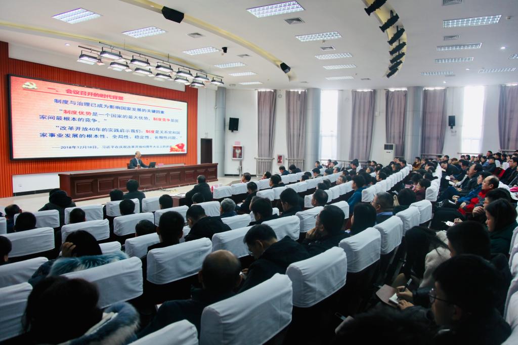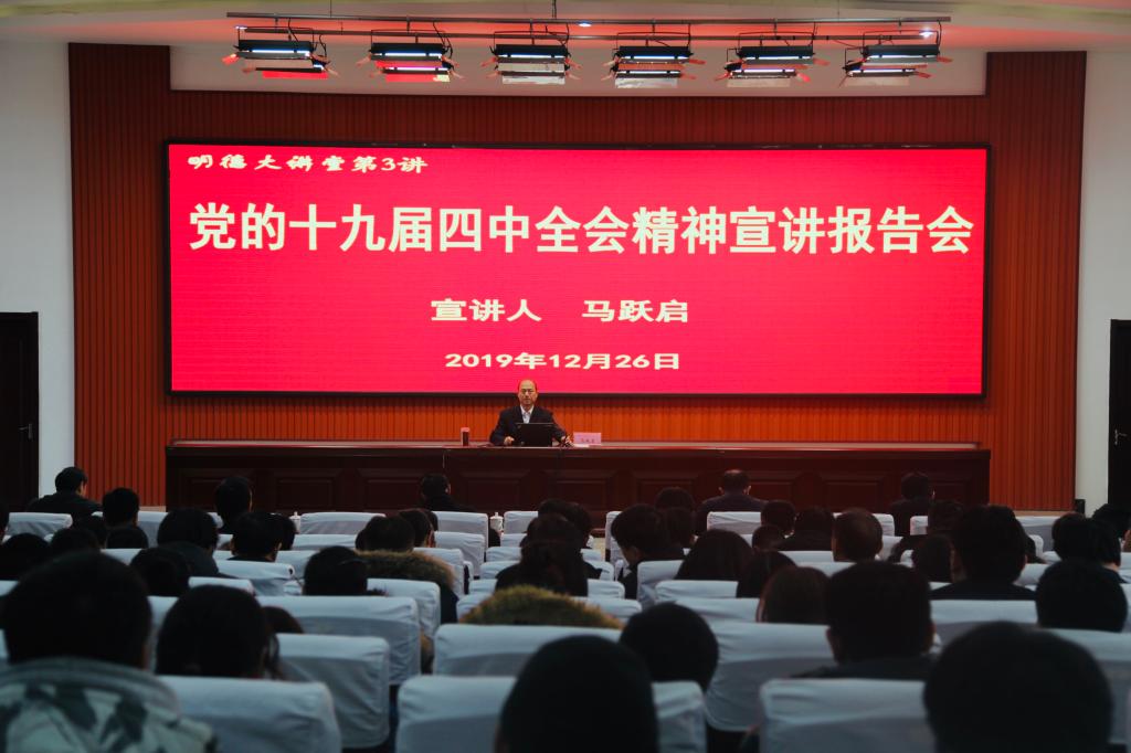 为深入学习宣传贯彻党的十九届四中全会精神,进一步用全会精神统一思想、凝聚共识,根据市委统一部署,12月26日上午,公司党的十九届四中全会精神宣讲报告会在清泽楼报告厅举行,党委书记马跃启同志作宣讲报告。公司领导宋桂言、赵君堂、李瑞昌、郭晓辉、刘德强,公司中层干部和教师代表、员工代表参加报告会。 马跃启以“新时代中国之治的行动纲领”为题,围绕“会议召开的时代背景”“坚定中国特色社会主义制度自信”“中国特色社会主义制度的显著优势”“新时代中国之治的战略部署”四个方面的问题,深入阐释了党的十九届四中全会的重大意义和中国特色社会主义制度与国家治理体系的显著优势,对全会《决定》提出的总体要求、总体目标和重点任务进行了系统解读,对认真学习宣传贯彻党的十九届四中全会精神谈了认识体会。 马跃启指出,要把学习宣传贯彻习近平总书记重要讲话和党的十九届四中全会精神作为一项重大的政治任务,切实增强“四个意识”、坚定“四个自信”、做到“两个维护”,坚持制度优势,优化治理体系,完善制度集成,提高治理效能,把党的十九届四中全会确定的各项目标任务落实到位。他还结合自己的亲身经历,以个人的视角阐述“我们党领导人民创造了世所罕见的经济快速发展奇迹和社会长期稳定奇迹,中华民族迎来了从站起来、富起来到强起来的伟大飞跃”,大大激发了参会师生的爱国热情。 宣讲报告聚焦重点和关键,内涵丰富、系统全面,深入浅出、鲜活生动、论述精辟,令参加宣讲报告会的师生深受启迪,倍受教育。大家纷纷表示,要把学习贯彻四中全会精神与“不忘初心、牢记使命”主题教育结合起来,同履行自己教学、学习职责义务结合起来,确保全会精神落到实处、见到实效。(王立志供稿)