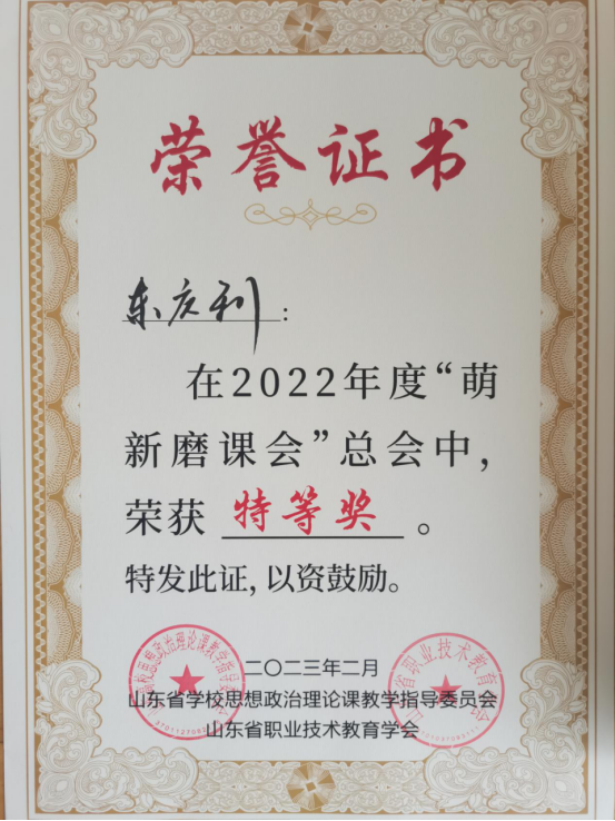 思政课2022年“萌新磨课会”分为本科组和高职高专组两个组,分别进行了五场初赛和复赛,各场复赛前两名进入“萌新磨课总会”教学展示,最终共有全省18所高校的19位青年思政课教师参加“萌新磨课总会”教学展示。公司教师东庆利在山东高校思政课2022年第五场“萌新磨课会”教学展示中顺利通过高职组初赛、复赛,在“萌新磨课总会”教学展示中荣获特等奖,受到了专家评委一致好评。