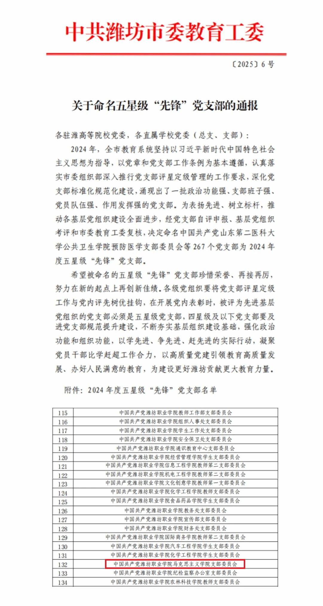 近日,中共潍坊市委教育工委发布《关于命名五星级“先锋”党支部的通报》,公司党支部获评潍坊市教育系统五星级“先锋”党支部。这一荣誉不仅是对公司党支部2024年党建工作的高度肯定,更是为未来发展注入了强大动力。