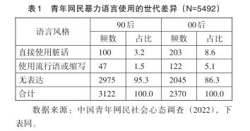 在生育观上,00后较90后生育意愿更低。中国青年网民社会心态调查(2021)数据显示,90后青年网民中愿意生育的占17.9%,而00后青年网民中明确表达愿意生育的仅占8.4%;90后青年网民中不愿生育的占37.2%,而00后青年网民中不愿生育的比例更高,为44.7%。在工作观上,00后较90后更倾向体制内的工作,其反对“躺平”的比例低于90后。中国青年网民社会心态调查(2021)数据显示,00后青年网民更倾向在体制内工作(44.5%),更倾向稳定、松弛的工作;而90后青年网民更倾向体制外的工作(36%)。与此同时,00后反对躺平的比例(75.7%)低于90后的比例(83.3%)。在网络行动上,00后较90后更加注重自由和表达,具有更强的叛逆性。中国青年网民社会心态调查(2021)数据显示,00后对于饭圈大粉的反抗行动显著高于90后,有反抗大粉相关网络行动的网民占比是90后的2.24倍。在网络表达中的暴力语言使用上,也呈现了显著的世代差异。中国青年网民社会心态调查(2022)数据显示(见表1),相比较90后网民,各种形式的暴力语言表达都在00后网民中更加流行。